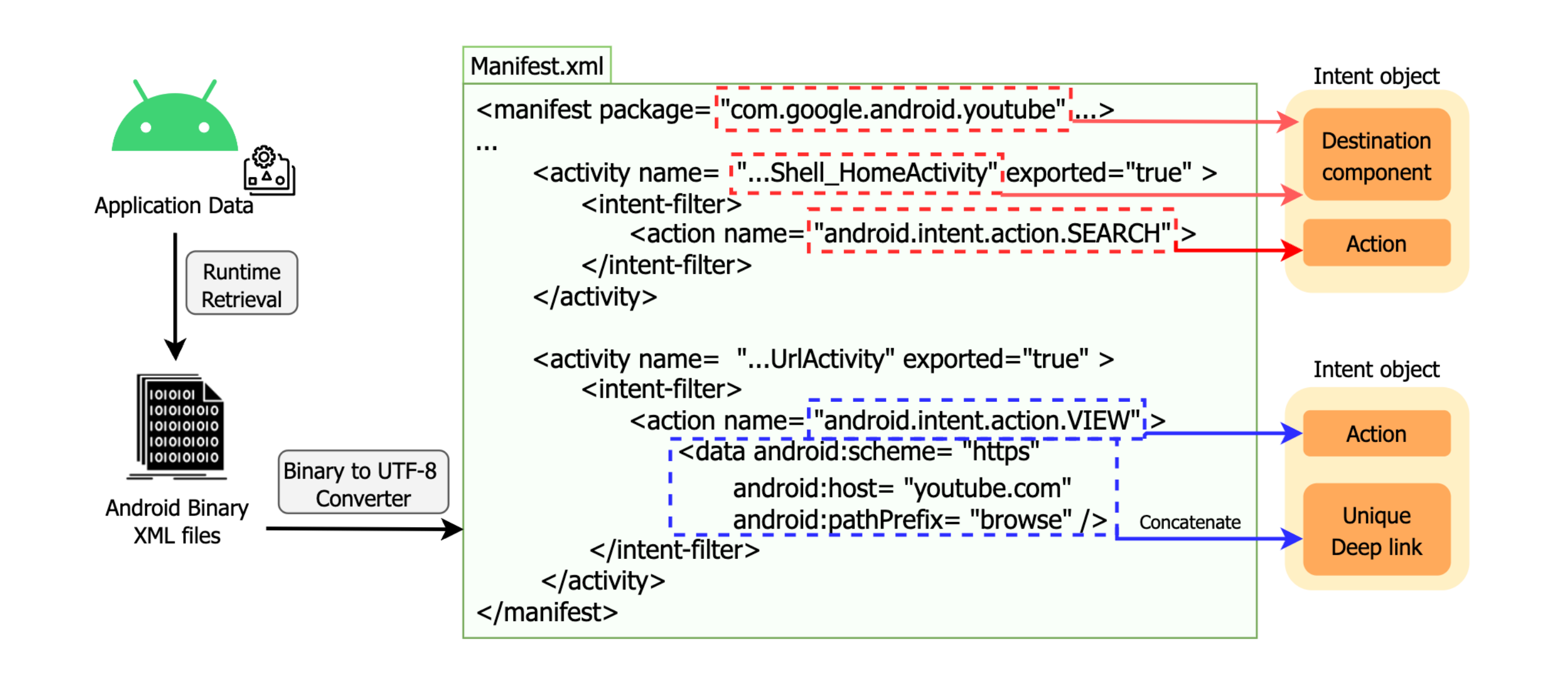1.在 app 应用数据中获取 Manifest.xml 之后静态分析获取 Intent object 从中提取出目标组件和动作